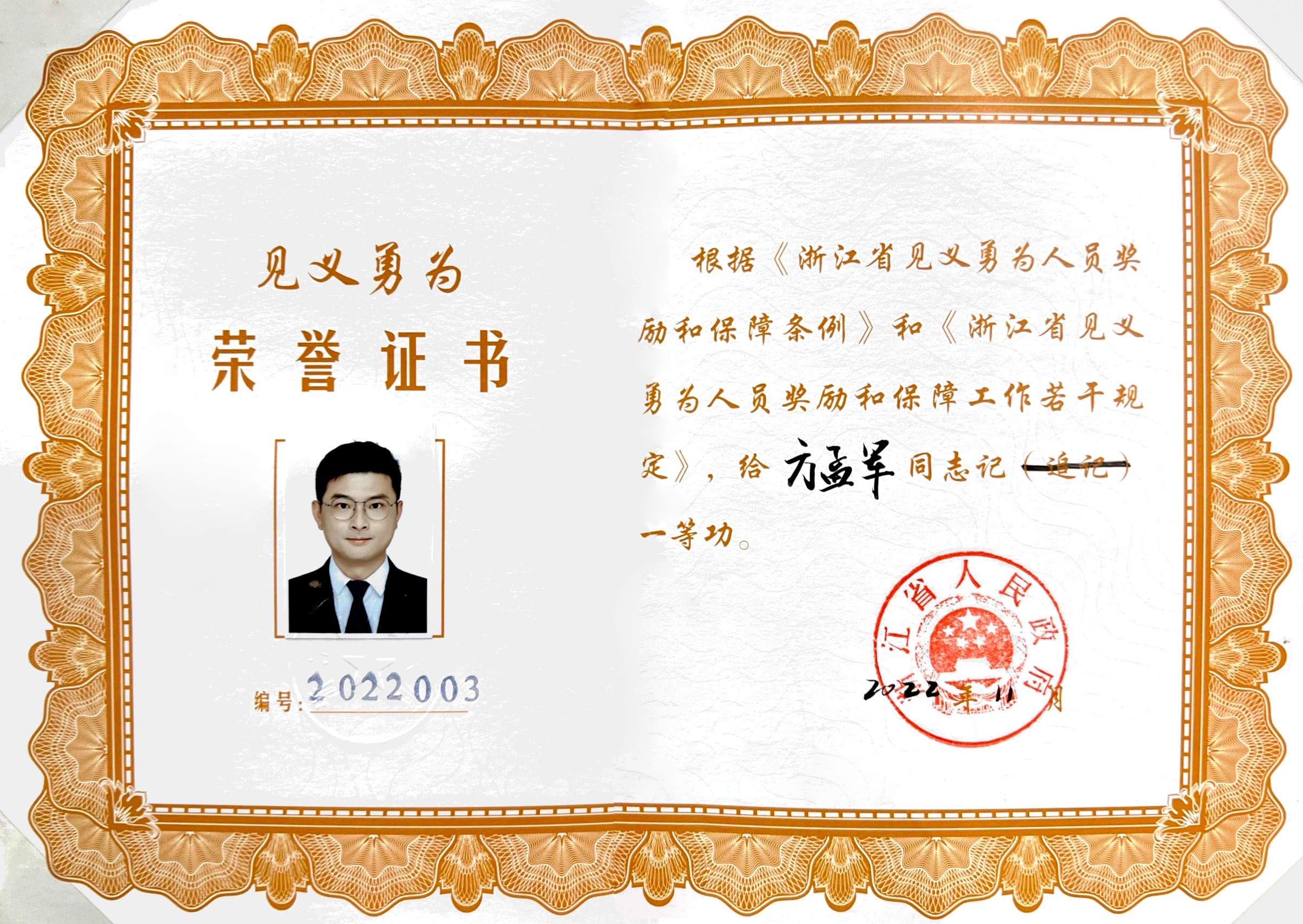 今年11月22日是浙江省第七個“見義勇為宣傳日”。11月16日上午,浙江見義勇為先進(jìn)人物記功獎勵暨見義勇為工作會議在杭召開。省委書記袁家軍,省委副書記、省長王浩看望了2022年度全省見義勇為先進(jìn)人物或家屬代表。禾蕓嘉醫(yī)院員工方孟軍等16名見義勇為先進(jìn)人物被省政府記(追記)一等功。