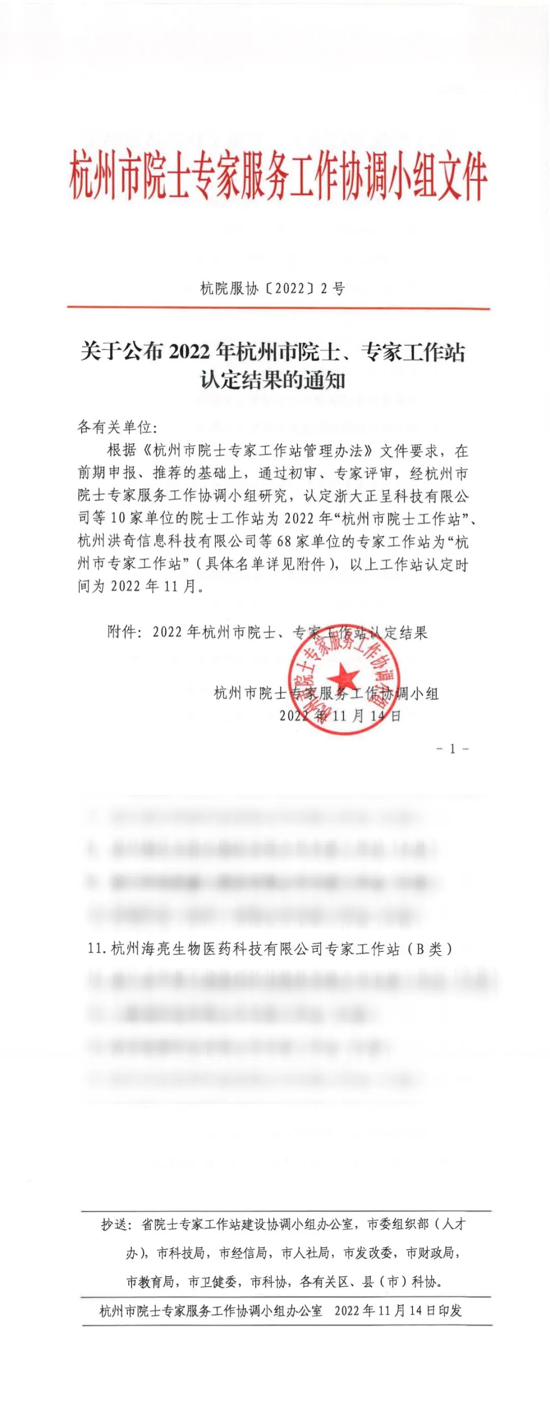 11月14日,杭州市院士專家服務工作協調小組發布《關于公布2022年杭州市院士、專家工作站認定結果的通知》,杭州海亮生物醫藥科技有限公司專家工作站被正式認定為“杭州市專家工作站”。