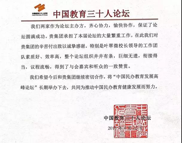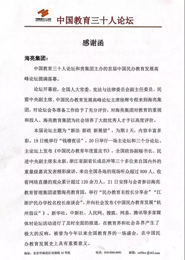 中國教育三十人論壇致函感謝海亮集團