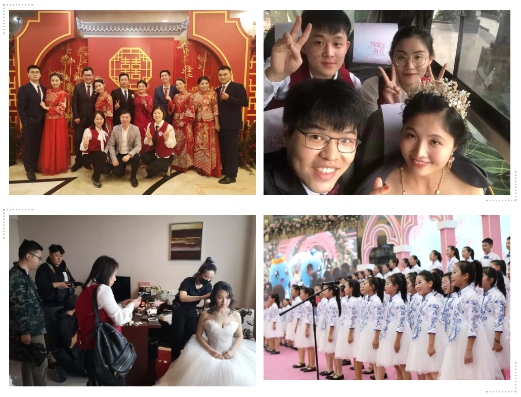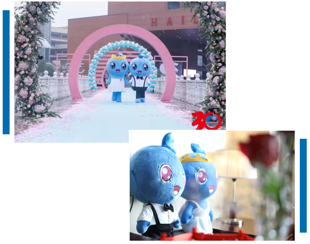 這次婚禮上有一對“萌物”,是基于海亮原來的吉祥物,特別設(shè)計(jì)的一對人偶吉祥物亮亮和靚靚。他倆也成了一對兒,陪同新人們走進(jìn)愛的禮堂。