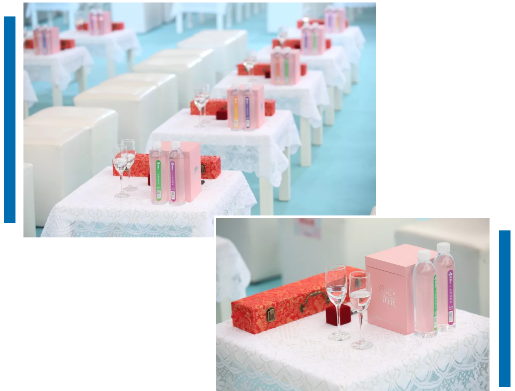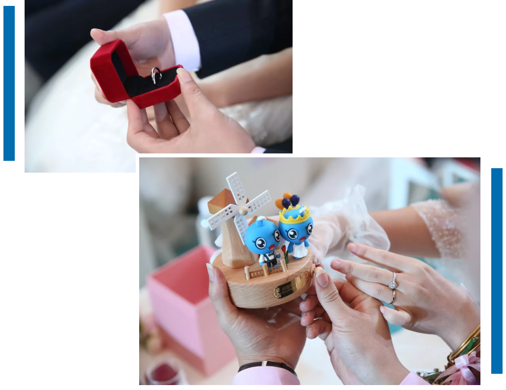 每對新人都擁有一份貼心的伴手禮,定制對戒和以“亮亮、靚靚”為主角的八音盒,每個(gè)八音盒的底座上都印著新人的名字。