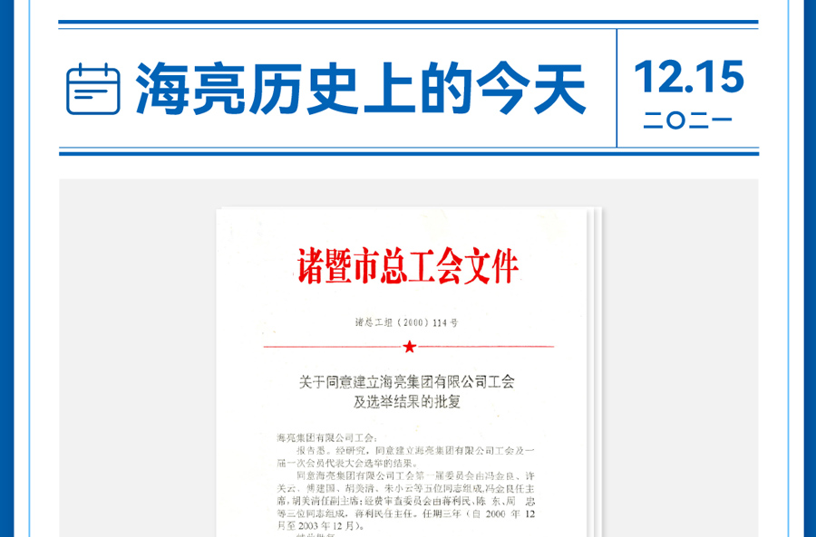 2000年12月15日,海亮集團有限公司工會經諸暨市總工會批復...