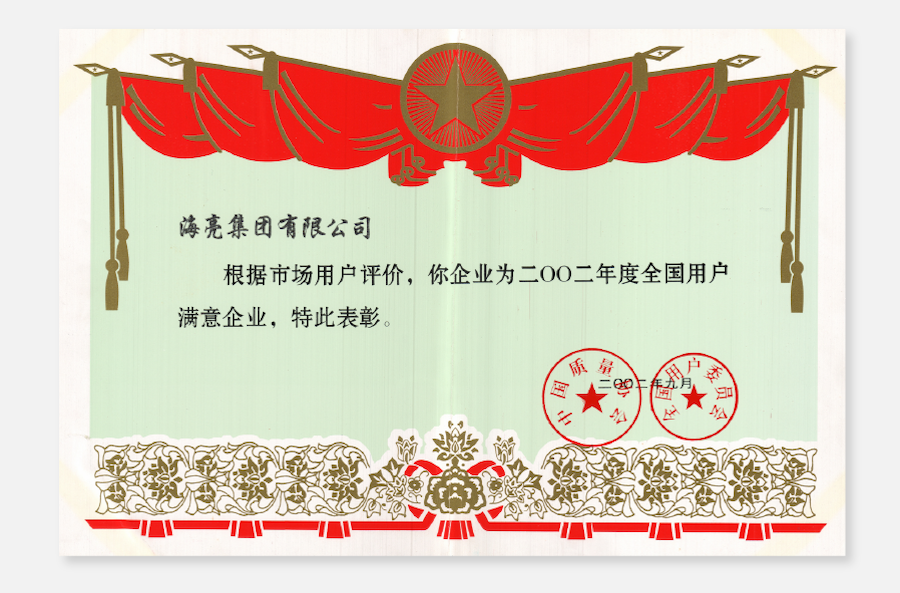 2002年9月20日,海亮集團榮獲“2002年度全國用戶滿意企...